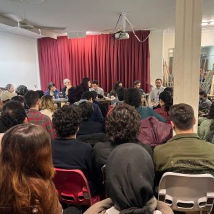 دانشکده هنرهای زیبای دانشگاه تهران، از چپ: علی ذاکری، فرامرز توحیدی، مرتضی کرمانی، حمید رحمتی، فرهاد صادقی، علی اصغر میرزایی مهر، استاد رویین پاکباز ، عبدی، فرج، قربانی، مومنی و حسن موریزی نژاد در قاب پنجره...از فیسبوک فرامرز توحیدی، 1