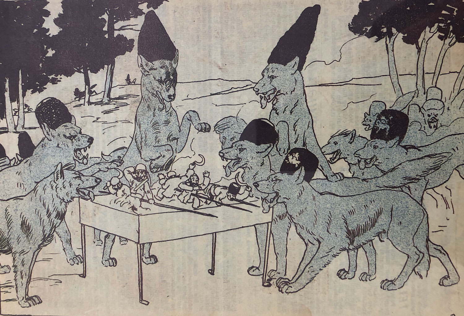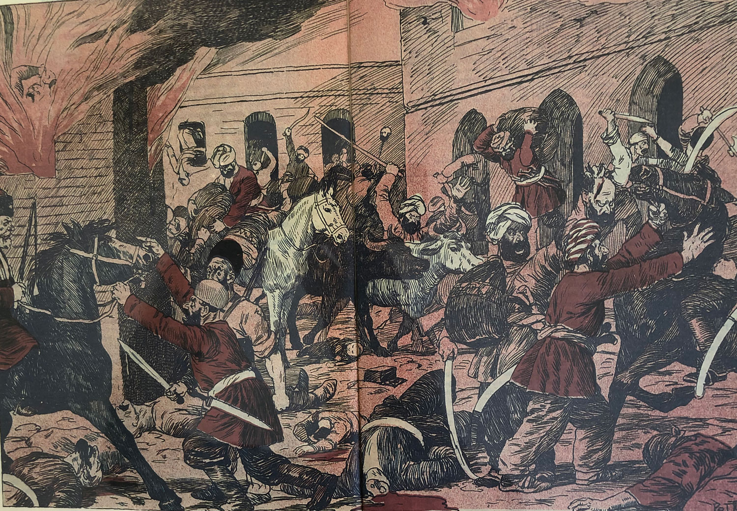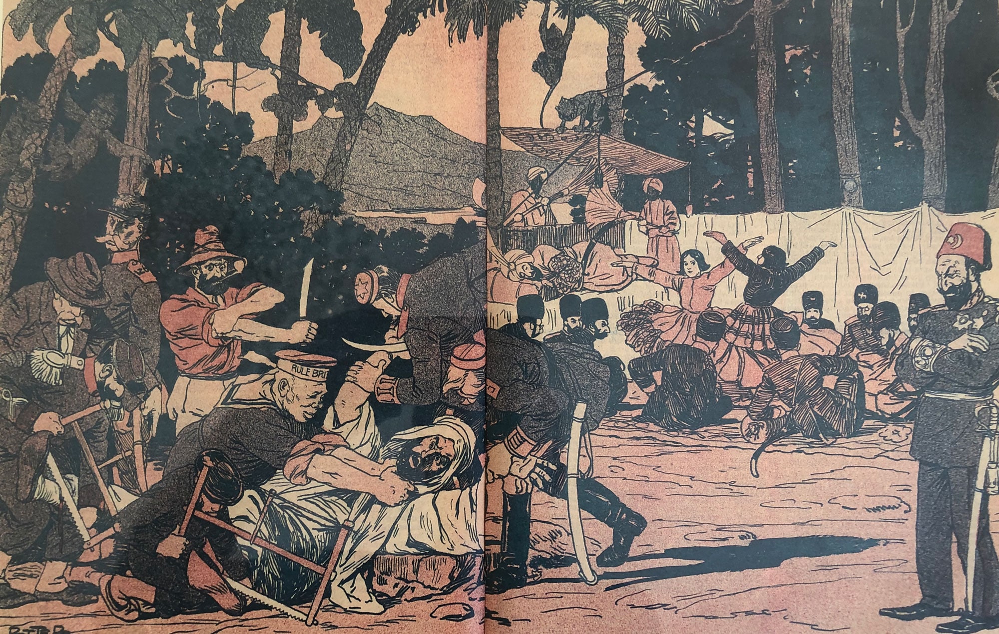 کشورهای اروپای غربی همچون قاتلانی متجاوز به تصویر کشیده شدهاند، درحالیکه مردم مشرقزمین همچون قربانیانی درمانده یا ناظرانی ناآگاه ترسیم گردیدهاند.۵۰ درحالیکه قربانی وحشتزده نظارهگر حملهی سربازان به بدنش است، واکنشهای نمایندگان مختلف مشرقزمین را شاهد هستیم. سلطان عبدالحمید عثمانی از دور و بیاعتنا به تکهتکه شدن مرد عرب نگاه میکند. در همین حال، گروهی از ایرانیان که پشت به صحنه هستند میرقصند و خود را سرگرم میکنند، تعدادی از هندیان نیز آسوده به خواب رفتهاند. (تصویر 16) دغدغهی روتر تنها جنگهای استعماری و امپریالیستی نیست، بلکه او منتقد سرسخت جنگهای داخلی قومی و قبیلهای نیز هست. او در صحنهی دیگری از جنگ، جنگهای قبیلهای بین کردها و قوم شاهسوند را در استان آذربایجان ایران به تصویر میکشد. در این نگاره مردان با شمشیر یکدیگر را مثله و غنائم جنگی را جمع میکنند، درست همانند کشتارهای بیمعنایی که در فجایع جنگ گویا به تصویر کشیده شده است (تصویر 17).