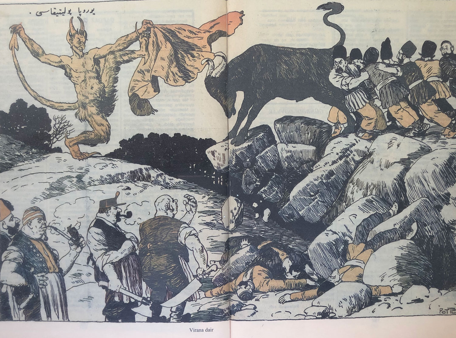 از گویا مجموعهای از نگارههای گاوبازی نیز به یادگار مانده است.۵۱ روتر یکی از صحنههای گاوبازی گویا را اقتباس میکند (که شاید در نظر اول با فرهنگ ماورای قفقاز یا خاورمیانه ناهمخوان باشد). در این اثر روتر، دیپلماسی اروپا در قالب شیطان تجسم یافته است که همچون گاوبازی چیرهدست نشان داده شده است. شیطان با شنل سرخ ماتادوری خود میکوشد ملت دیگری از مشرقزمین را ــکه به شکل گاوی بسیار عضلانی به تصویر کشیده شده استــ فریب داده و به درهی مرگ هدایت کند. گاو به شکل خطرناکی در لبهی پرتگاه ایستاده است، در حالی که مردم مشرقزمین دارند او را به سمت لبه هل میدهند. در همین حال، در پایین دره، قدرتهای استعماری خندان منتظر سقوط قریبالوقوع گاو هستند و شمشیرهایشان را آماده کردهاند، گویی میخواهند گاو را تکهتکه کنند. (تصویر 18)