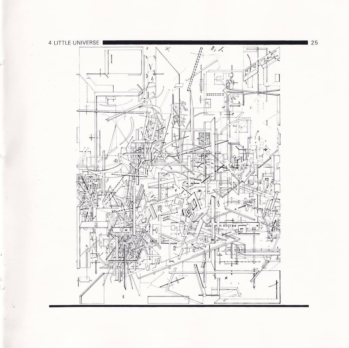در ترسیم شماره‌ی ۴، دنیای کوچک۱۵، حضور همزمانِ بازنمایی‌های مایل، آکسونومتریک، و ایزومتریک، هر نوع خوانشِ یگانه را ناممکن می‌کند. خطچین‌ها نشان می‌دهند که اشیائی پشت سرِ موقعیت فرضیِ ناظر قرار گرفته‌اند و در نتیجه، در تضاد با آنچه بازنمایی‌های آکسونومتریک و مایل نشان می‌دهند، به‌طور ضمنی نشان می‌دهند که آنچه ترسیم شده، یک شیء بیرونی نیست و ناظر درونِ میدانی از اشیاء قرار داده شده است: پشت ناظر به میدانی کم‌تراکم از اشیاء است و روی او به میدانی متراکم از هندسه‌های درهم‌تنیده. هندسه‌ی ترسیم، از دیوارها، بازشوها، و اشیائی که در ظاهر، بدونِ جهت‌مندی و نظم مشخصی در کنار هم قرار گرفته‌اند، تشکیل شده است. عناصری که زبان فرمیِ مشابهی دارند، در مقیاس‌ها و جهت‌های مختلف تکرار می‌شوند؛ انگار که هر نوع اصل نظم‌دهنده‌ای معلق شده و یا به‌طور کامل ناخواناست. عرف‌های بازنماییِ سنتی در عین حال که درونِ قلمرو خود حفظ شده‌اند، اما در کلیت ترسیم، و به‌واسطه‌ی کنارهمِ قرارگیری سرنگون شده‌، و ایدئال رنسانسیِ یک نقطه‌ی دیدِ یگانه را انکار می‌کنند. درست مثل نقاشی‌های پیکاسو و براک۱۶، این ترسیم نقاط دیدِ مختلف را در قالب یک میدان بصریِ یکه در کنار هم قرار می‌دهد. سیستم‌های چندگانه‌ی بازنمایی، به جای حل شدن درونِ یک بازنمایی یکه، ناهمخوانیِ پربار خود را حفظ می‌کنند. به این ترتیب، لیبسکیند نقطه‌ی دیدِ ثابت و انسان‌گرایِ رنسانسی را معلق می‌کند: ناظر به‌طور مرتب در حال تغییر مکان است و می‌تواند چیزهایی را ببیند که دیدنِ آن‌ها درواقعیت غیرممکن است.
