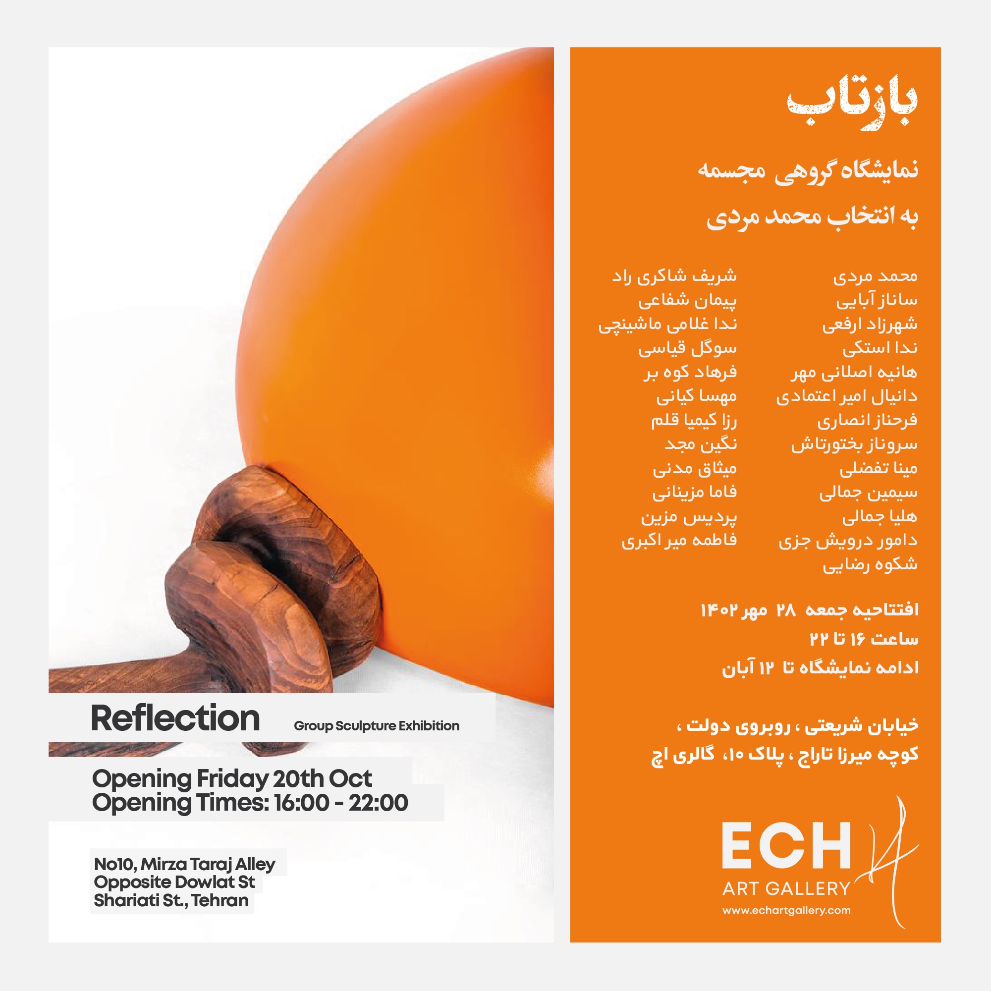 نمایشگاه گروهی مجسمه «بازتاب» به انتخاب محمد مردی افتتاحیه جمعه ۲۸ مهر ۱۴۰۲ از ساعت ۱۶ تا ۲۲ ادامه نمایشگاه تا ۱۲ آبان