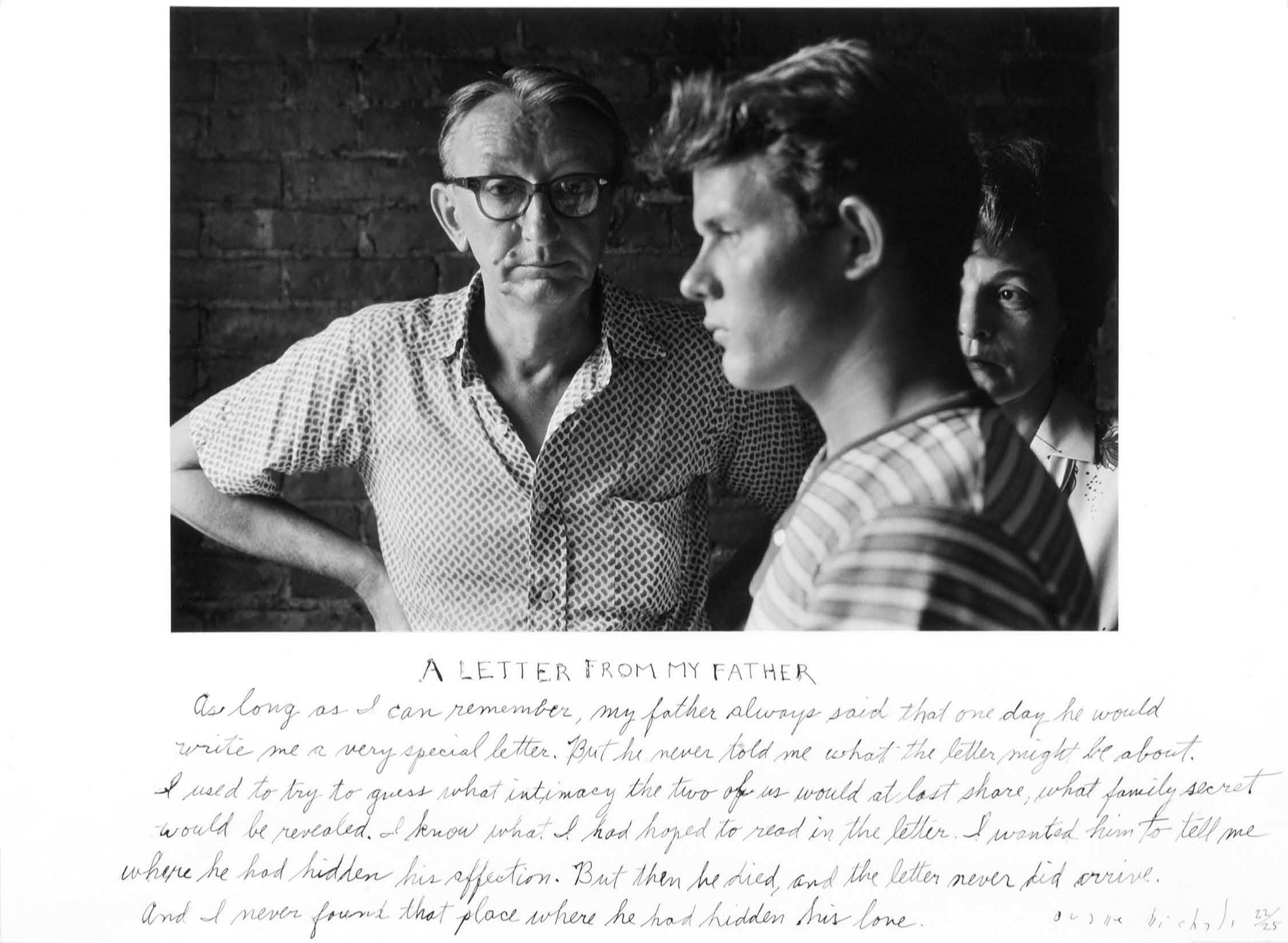 رایج است که عکسها به شکل رایج با کلمات همراه میشوند. معمولاً این کلمات بهعنوان زیرنویس عمل میکنند. درصورتیکه هرگونه شکی برای آنچه تصویر عکس نشان میدهد وجود داشته باشد آن را توضیح داده یا هویت میبخشد. زیرنویسها با زبان تصویر را جهت میدهند. بهخاطر اینکه عکسها چگونگی ظاهرشدن کسی یا چیزی در زمان و مکانی مشخص را ثبت میکنند. چیزهایی که دیگر هیچوقت مثل قبل نخواهد بود چون زمان میگذرد، چیزها تغییر میکنند و ظواهر زودگذرند. عکسها به تصدیق و بستر معنایی[۱۴] نیاز دارند تا معنا داشته باشند. نشانهشناسی میانقرنی به ما یاد داد، درک تصویر عکاسانه به عنوان معناهای صریح[۱۵] نیازمند معنای ضمنی[۱۶] است. در تصویر نامهای از پدرم[۱۷] (۱۹۷۵) (شکل ۳.۴) ما مردی جوان را در سمت راست تصویر میبینیم در نیمرخ که در پیشزمینه سمت چپ را میبیند، مرد پیری روبهروست و مرد جوان را در زمینة وسط میبیند و زنی در دورترین بخش راست تصویر پشت سر مرد جوانتر زمینة وسط را اشغال کرده است. زن توسط شکل دهانش و یقة بلوزش و گیسوپوش موهایش تمایز پیدا میکند. تفاوت سنی دو مرد توسط پیشانی چروکخورده و خطموی عقبرو مردی که پیرتر بهنظر میرسد و مدل موی مردی که جوانتر است مجزا میشود. عکس در سال ۱۹۶۰ گرفته شده است. لحظاتی دیگر به این جزئیات میرسیم. در سال ۱۹۷۵ مایکلز این متن را اضافه کرد.